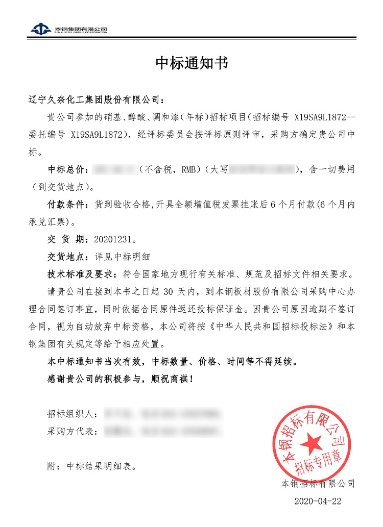 本鋼中標(biāo)通知書