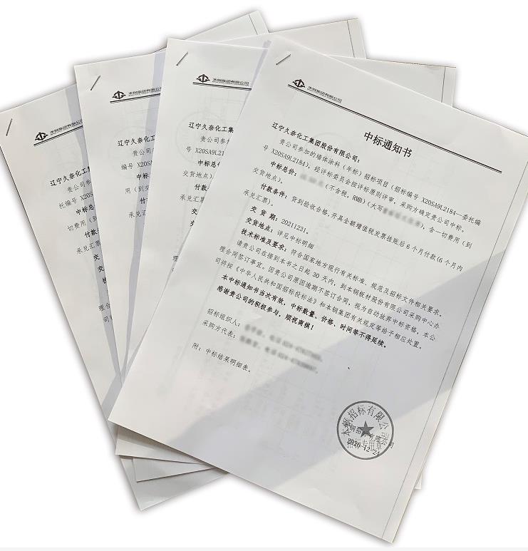 2020年12月24日,遼寧久奈化工集團(tuán)股份有限公司(以下簡(jiǎn)稱遼寧久奈化工)收到本鋼集團(tuán)有限公司出具的《中標(biāo)通知書(shū)》,重防腐油漆、硝基,醇酸漆、特種油漆年采購(gòu)訂單。