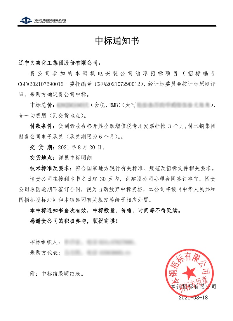 2021年8月18日,遼寧久奈化工集團(tuán)股份有限公司(以下簡(jiǎn)稱(chēng)遼寧久奈化工)收到本鋼集團(tuán)有限公司出具的《中標(biāo)通知書(shū)》,本鋼機(jī)電安裝公司油漆招標(biāo)項(xiàng)目。