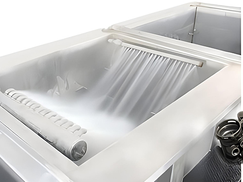 4:漂洗槽,為長方形結(jié)構(gòu),中間隔開,分兩道清洗,清洗盲孔余膠功能,底部裝有氣助鼓泡攪拌裝置,有吊籠放置架,一般清洗時(shí)間2分鐘/次,吊出后用氣吹去表面和盲孔里的水份,然后放入熱水箱。